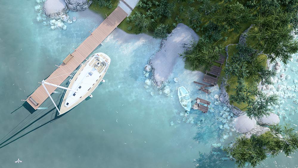 « Pour ce concours, j’ai voulu créer un projet qui puisse servir d’exemple dans le logiciel Lumion. J’ai donc pensé à utiliser toutes les fonctionnalités de Lumion pour créer une maquette avec des zones distinctes et des ambiances différentes. J’ai commencé par délimiter les bordures de mon projet en utilisant la fonction océan pour créer une île.